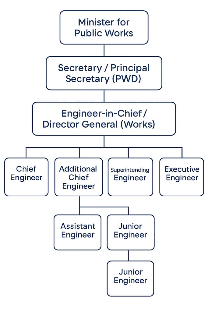 A Chief Engineer typically heads the PWD. Below this level are Superintending Engineers, Executive Engineers, Assistant Engineers, and Junior Engineers. Many PWD engineers are recruited through state public service commissions or through engineering services examinations.